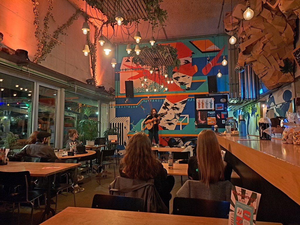 Nun ging es natürlich an diesem Mittwoch Abend nicht um meine eigene emotionale Reise sondern um die von Julian Brown und die von Brino. Julian Brown war alleine mit seiner Gitarre und seinem Loop Gerät auf der Bühne und mehr brauchte er auch nicht. Dieser, ich behaupte jetzt einfach mal, ziemlich junge Mann, hatte schon viel zu sagen über das Leben und die Liebe. Mauern, die uns davon abhalten jemanden wirklich zu lieben oder wie man irgendwann einfach mal gehen muss. Da kam viel zusammen und es waren schöne Songstrukturen und noch schönere Texte. Das Loopgerät musste meistens für die Gesangsharmonien und ein bisschen Perkussion mit der Gitarre herhalten. Ziemlich cool bei den meisten Songs aber manchmal passte auch nicht so wirklich zum Rest vom Song.