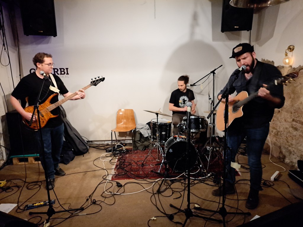 Andreas Hess war an diesem Abend in der Gewerbehalle der einzige der nicht auf die eine oder andere Weise angeschlagen war (oder er liess es sich einfach nicht anmerken). Die drei Musiker (Andreas Hess hatte noch einen Bassisten und einen Schlagzeuger dabei, die aber anonym blieben) spielten Songs die wohl vielen aus der Seele sprechen. Er habe Songs, die entweder von Herzschmerz oder Alkohol handeln, meinte er zu Beginn aber es waren auch politische Songs dabei und auch schwierige Beziehungen zu ehemaligen Mitbewohner:innen wurden behandelt. Immer auf diese selbstironische, unterhaltsame die-Ärzte-Art konnte man sich richtig in die Songs reinfühlen. Man wollte schon fast selber zu Tabea sagen sie solle endlich mal die Fresse halten und man überlegte sich die Beine zu rasieren wegen des Luftwiderstandes.