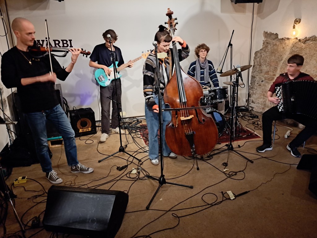 Caspar von Nebenan war dann fast ein bisschen ein Kulturschock. Fünf potenzielle Jazz-Student:innen hatten sich in der Gewerbehalle positioniert. Mit Geige, Kontrabass, Akkordeon, E-Bass und Schlagzeug spielten sie traditionelle Lieder auf eine moderne Art und Weise. Ihr Set mussten sie kurzerhand ein bisschen umstrukturieren, da Kontrabassistin und Sängerin Lia Neff ihre Stimme nur eingeschränkt nutzen konnte. So musste ihr Bruder Dimitri ein bisschen mehr den Leadgesang übernehmen, es wurde kurzerhand der grösste Fan aus dem Publikum für einen Song rekrutiert und sich einfach ein bisschen mehr auf den instrumentellen Teil ihrer Songs konzentriert. Trotz alle dem spürte man die jugendliche Frische, Unbeschwertheit und Leidenschaft in ihren Liedern.