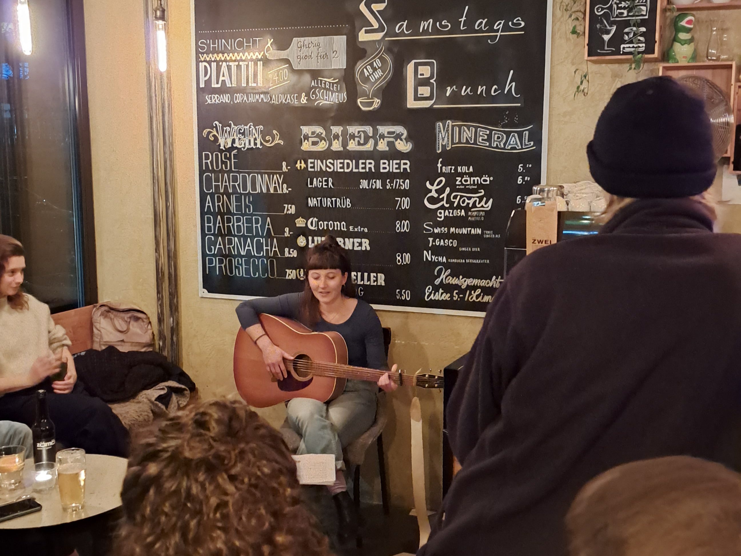 Vielleicht lag es daran, dass tatsächlich viele Freunde von Jasmin Larue an diesem Abend da waren oder an der heimeligen Atmosphäre des Hinichts aber die ganze Runde hing entweder gebannt an den Lippen von Jasmin Larue oder war beseelt im Stuhl nach hinten gelehnt. Auch die Geschichten zu den Songs und die Timeline, die sie sich zum Set überlegt hat wurden mühelos in das Set eingefügt und man fühlte sich gleich noch mehr zu Hause.