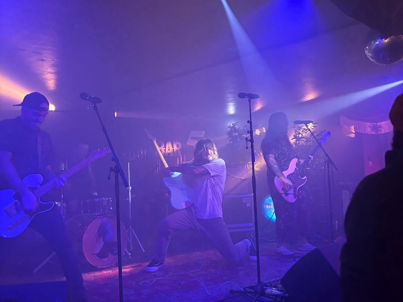 Die Band liess gleich los und hatte sichtlich Spass auf der Bühne. Die Gitarren bretterten, die Rhythmus-Sektion trieb die Songs voran und die Posaune (!) spielte obenauf und verwandelte die, für einen Mittwoch Abend gut gefüllte, Bar59 in eine Tanz- und Hüpffläche. Die Stimmung war vom ersten Song an ausgelassen und zauberte vielen Besucher:innen ein zufriedenes lächeln ins Gesicht, was wiederum auf die Band zurückstrahlte und diese erstaunt feststellen liess, dass es mega schön sei, dass an einem Arbeitstag unter der Woche so viele Leute den Weg in die Bar59 gefunden hätten.